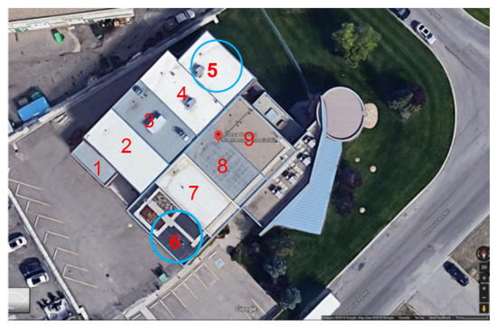 The ARCA headquarters’ building has nine different types of conventional roof assemblies with different configurations. For this study only two roofs, labeled Roof #5 and Roof #6 in Figure 1, were selected for the following properties: same polyisocyanurate insulation board material, limited thermal bridging, and contrasting white and black membrane emissivity values.