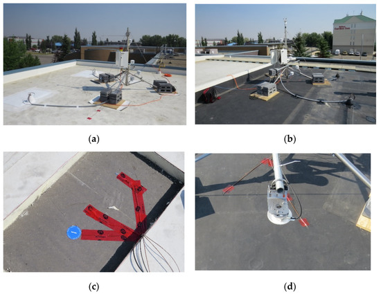 Field measurement station showing (a) Roof #5; (b) roof #6, (c) heat flux sensor, (d) surface thermocouples.