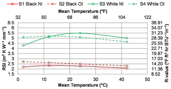 Because insulation thickness S1 and S2 had significantly lower thermal resistance than S3 and S4, similarly, S1 was thinner than S2. In contrast to other sites, the thermal resistance of insulation at S3 shows significant variation when measured at different mean temperatures. The measured peak thermal resistance was 5.49 m2·K·W−1·mm−1 (31.2 °F·ft2·h·BTU−1) at the reference Tm = 24 °C (75 °F), and at Tm = 2 °C (36 °F) there was a steep drop in thermal resistance of about 22% from the reference Tm and at Tm = 42 °C (108 °F) the decrease was 9%, in contrast to S4 where the measured peak resistance of 5.19 m2·K·W−1·mm−1 (29.5 °F·ft2·h·BTU−1) at Tm = 12 °C (54 °F), and only experienced a drop in thermal resistance of about 2%. Comparing S1 and S3, the thermal resistance of S1 followed a linear profile similar to open cell insulations like EPS, and XPS. Table 2 reports the measured thermal resistance values at the standard reference temperature of 24 °C (75 °F).