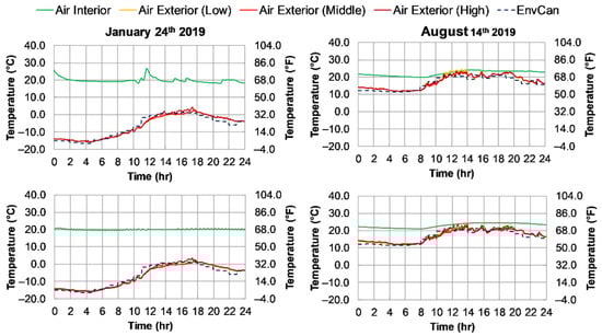 Figure 6 provides the ambient exterior and interior temperature data as measured by both weather stations during a typical day in winter (24 January 2019) and summer (14 August 2019). Historical data from Environment Canada’s weather station at Calgary International Airport, Alberta (51°07′21.000″ N 114°00′48.000″ W, 1099.10 m ASL) was used to verify the data.