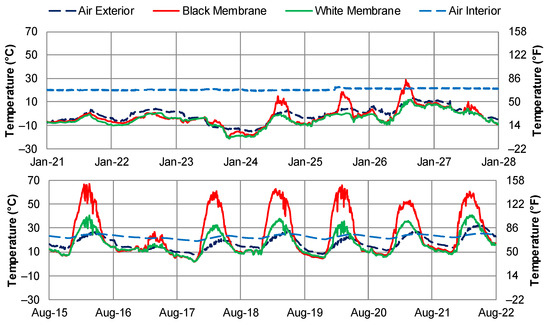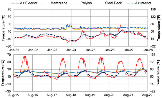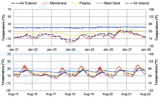 Roof assembly temperature profile of S1 (Black NI) during 21–27 January 2019 and 15–21 August 2019.