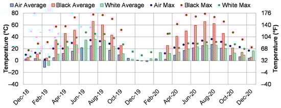 Monthly average of the daily maximum surface temperatures of both black and white membranes (S1 and S3) and their monthly maximum.