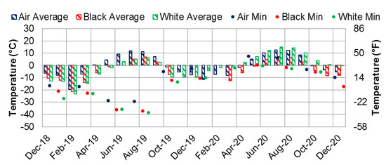 Monthly average of the daily minimum surface temperatures of both black and white membranes (S1 and S3) and their monthly minimum.