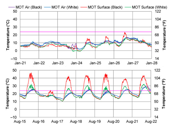 Figure 12 shows the calculated MOTair and MOTsurf of the roofing assembly during a typical week in January and August. The pink line designates the value of 24 °C (75 °F). In the winter days, it is clear that the average for MOTair and MOTsurf is well below 24 °C (75 °F). Also, the difference between the values of MOTair and MOTsurf is relatively minimal, as surface and air temperatures are mostly similar during these months. The only exception is that the MOTsurf of the black roof assembly can substantially deviate on sunny winter days. When using the surface temperatures, the MOTsurf for black membrane assemblies can be significantly higher than the roofing assemblies with a white membrane, especially on clear sunny days. During the summer the MOTsurf of both the assemblies follow a similar pattern with the values regularly reaching above and below 24 °C (75 °F).