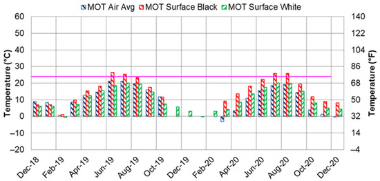 Monthly average of the daily maximum mean operating temperatures (MOT) for both black and white roof membranes (S1 and S3).