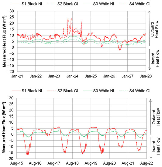 Measured heat flux from S1 through S4 from 21–27 January 2019 and 15–21 August 2019.