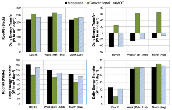 Average daily energy transfer through S1 (Black NI) and S3 (White NI) roof assemblies for a six-month period between December 2018 and May 2018.