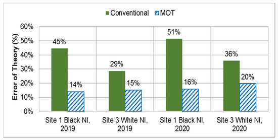 Figure 17 shows the average relative error of each of the two models for both the S1 and S3 for the cumulative six-month period from December 2018 to October 2019. This figure clearly shows that the conventional model (ambient conditions, with thermal resistance at MOT 24 °C (75 °F) has the highest error for both the test sites S1 and S3 reaching 45% and 29% respectively. As QMOT considers both the surface temperature and temperature-dependent thermal resistance of the insulation, this model yielded the best results with errors of 14% and 15% for S1 and S3 respectively.