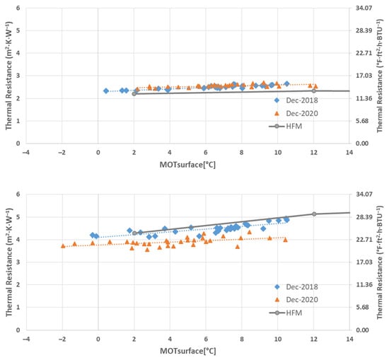 For the evaluation of the thermal resistance of the roofing assembly, the resistance of the roofing assembly was determined on a daily basis based on the average of thermal resistance measurements made overnight during a period of relatively stable heat flows from 1:00 AM to 5:00 AM). For each of the sites, S1 and S3, the MOTsurface was plotted vs. the thermal resistance (Figure 18). For site 3, the thermal resistance is also compared to the results for the heat flow meter for the month of December 2018 (the earliest data available) vs. December 2020 (the latest data available) (Table 4). Over the study period there has been an approximate drop in thermal resistance of 11%. Further testing of laboratory samples and further in situ testing data are required to confirm this apparent drop in thermal resistance and determine if the loss in thermal resistance is a result of a loss in blowing agent or the result of moisture ingress into the insulation. In addition it will be necessary to further assess the implications of the estimates of thermal performance presented in this paper.