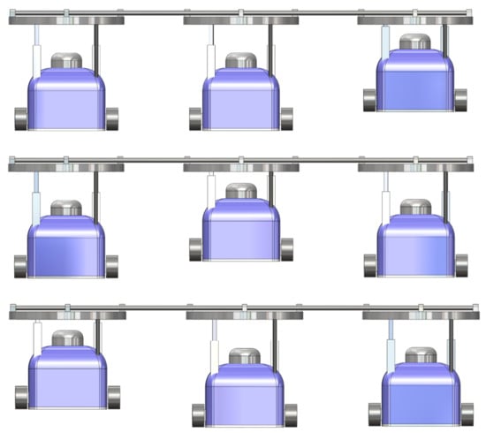 The objective of the Mantis-mini platform is to clean a glass window panel and transit the next panel without human intervention. For this platform to transit to the next panel successfully, any two modules must hold the system on the surface of the façade and must be sufficient to drive the system. Hence, the contact area of the platform on the façade changes during transitioning. After transitioning, the modules align themselves on the façade and the robot resumes cleaning of the second window. Figure 4 shows the different configurations of the Mantis-mini platform during panel transitioning. There are two phases during the transition. Firstly, two modules are in contact with the first window panel, driving the entire platform across to the next window panel. Secondly, the linear actuator will lower the first module onto the next panel and this is done until all 3 modules have crossed over to the second panel.