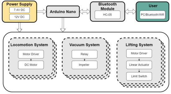 Figure 5 shows the electronics block diagram of Mantis-mini platform. The platform is powered by a 24 V DC power supply that drives the impellers of each modules and the motor drivers of the wheels. They are controlled using an Arduino Mega to send out commands for each motor driver and impellers. A 2 × 7 A Roboclaw motor driver and a voltage relay compatible with 3.3 V and 5 V appliances are used. The locomotion unit consists of two Solarbotics RW2i rubber robot wheel with thick silicone rubber tire for maximum traction. This wheel features an internal set screw hidden underneath the tire. This saves valuable space when designing robots with size constraints. The wheels are driven by two Pololu micrometal gear motors. These gear motors are a miniature high-powered, 12 V brushed DC motor with long-life carbon brushes and a 248.98:1 metal gearbox. It has a cross section of 10 mm × 12 mm, and the D-shaped gearbox output shaft is 9 mm long and 3 mm in diameter.
