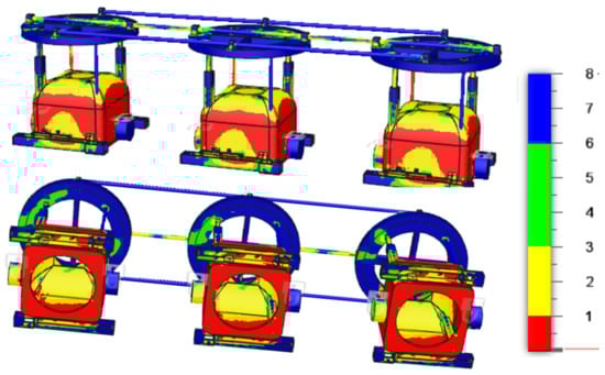 A static structural analysis is carried out in Workbench environment to study the gravitational (1 g) effect on the platform. A payload of 2.5 kg is applied as a uniformly distributed load on the base plate of the platform. Fixity boundary condition is applied at the ground-wheel contact point of the platform. The factor of safety and the deformed components of the platform are shown in Figure 8 and Figure 9. The maximum deformation is 24 mm, which occurs near the edge of the central opening of each module. This higher value is due to the stress concentration at the sharp edge of the central opening. The concentrated stress can be reduced by using filleting and providing extra material to the base. However, in other parts of the platform, the deformation is less than 5 mm. This deformation is approximately lesser than equal to the one-tenth of the critical dimension of the platform. Figure 10 presents the distribution of the principal stress in the platform. Maximum stress of magnitude 40 MPa, occurs near the wheel support which is due to stress concentration factor. However, the resulting stress on the platform is about 0.4 MPa, lower than the tensile stress of PLA (40 MPa). Therefore, the current platform design is considered to be safe.