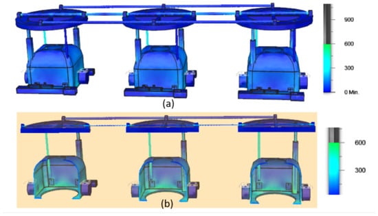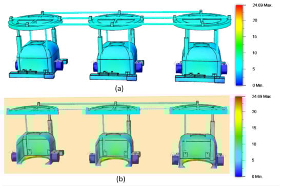 Stress distribution (MPa) in the Mantis-mini platform (a) full view and (b) sectional view.