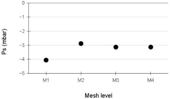 The 3D computational domain is discretized into four levels of mesh resolution in order to evaluate the numerical solution sensitivity, i.e., M1–M4, corresponding with 170,000, 490,000, 990,000, and 1,490,000 cells, respectively. The suction pressure values obtained from the simulations with base opening of 6 cm and impeller speed of 20,530 rpm using different mesh resolutions are shown in Figure 12. It can be observed that increasing the number of cells from M3 to M4 hardly changed the suction pressure, indicating mesh-independent solution at M3. Therefore, the simulations will be evaluated using M3 (990,000 computational cells).