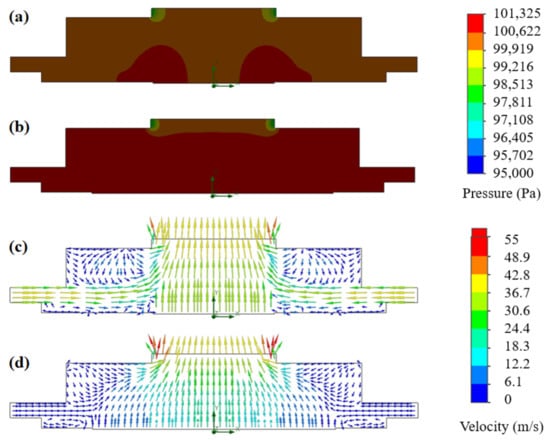 Cross-sectional views of steady-state fields at 20,530 rpm: (a) Pressure, 3 cm opening; (b) Pressure, 6 cm opening; (c) Velocity vectors, 3 cm opening; (d) Velocity vectors, 6 cm opening.
