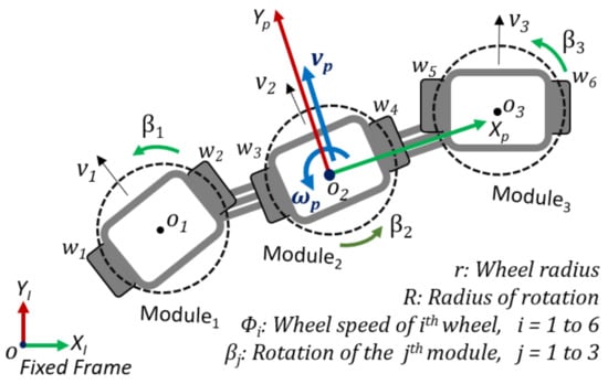where is cos of the steering angle of the wheel in the module 1,2,3 respectively. The position of the center of the mass of the platform is (). The distance between the wheels of each module and the centre of each module is denoted as l.