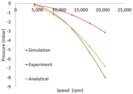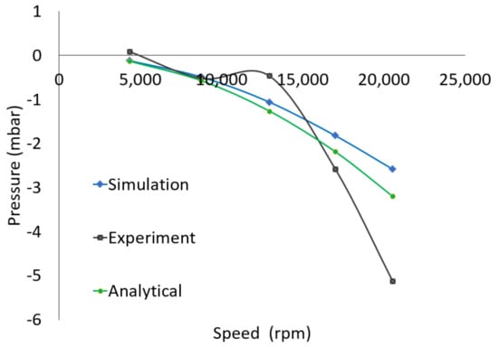 Figure 16 and Figure 17 depict how the pressure within the chamber varies with the motor speed with 3 cm and 6 cm opening, respectively. The pressure sensor inside the chamber was placed near the center, close to the top outlet boundary. The qualitative trend of the prediction using simulation, experiment, and analytical formula agree well with each other, i.e., the suction pressure magnitude increases with impeller speed and the opening size. Nevertheless, there is an obvious difference among the three, which can be explained as follow.