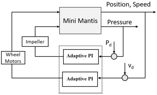 This platform incorporates a low level actuator control for ensuring proper adhesion and locomotion along a particular type of vertical plane. It must be noted that the impeller is responsible for providing negative pressure so that the platform does not lose contact with the vertical surface, whereas the motion is supported by a standard DC motor. Hence, the controller objectives are to regulate a required output pressure for the impeller and to regulate a desired speed for the DC motor. As the actuators responsible for these tasks are not the same, the controller design can be decoupled. The proposed controller architecture is presented in Figure 19.