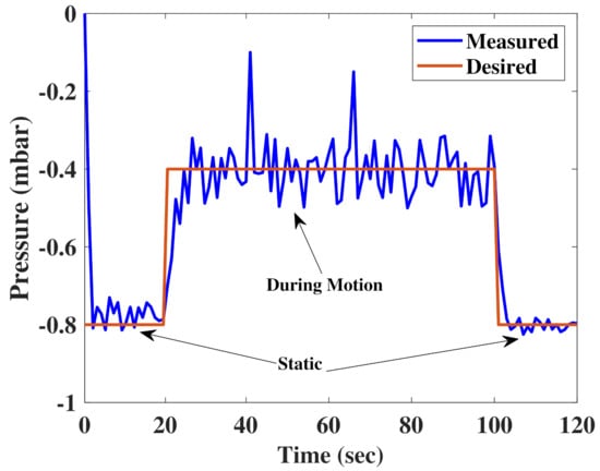 The control algorithm was implemented in the platform and the suction performance was tested. It is found that each module is able to balance itself in a static manner for a range of −0.4 mbar to −0.9 mbar. However, the smooth motion is obtained when the measured pressure is in the range of −0.4 bar. Therefore, the desired pressure commands are set at (−0.8, −0.4) mbar for the static and the dynamic case. The closed loop performance is plotted in the Figure 21. It is observed that there exists a short delay for the impeller to reach the desired pressures. However, the controller is able to provide a satisfactory regulation both for the static and dynamic cases. The variations in the measured pressure is due to sensor and environmental noise.