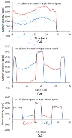 We have also conducted experiments to study and analyze the locomotion along different trajectories. These paths include the circular shaped, S-shaped as well as the Z-shaped motion. Similar to the prior experiments, the locomotion trajectories were carried out by the platform and the motor velocity in quadrature pulses per second (qpps) of the various motion trajectories is displayed in Figure 22a–c respectively. From the experiment, we can see that the platform has the ability to move along a curved path based on the differential wheel drive principle.