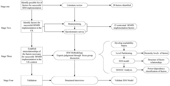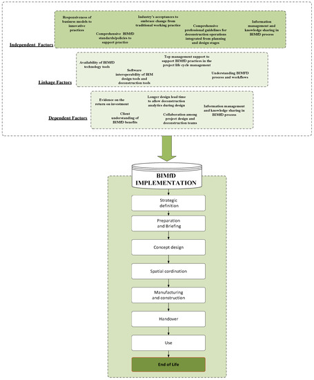 Studies promoting BIM for end-of-life performances, especially BIM for deconstruction (BIMfD), have been on the rise in recent years, and the potential benefits are well articulated in the existing literature [11,18,20,21,22,23,24,25,26]. These studies argue that while BIM is gaining increasing awareness and usage for construction and maintenance, BIM application should extend to capturing EoL performances such as deconstruction from design stages. Evidence from the Infrastructure and Project Authority [15] indicates that the UK Government Construction Strategy 2016–2020 report acknowledges the relevance of BIM implementation from design to asset management. This is further confirmed in the International BIM Report [27], which highlights that BIM uptake for construction rose to 72%, although BIM application in and for capturing EoL performances, such as deconstruction, were not particularly highlighted in the report. Furthermore, a study by Chong et al. [20] detailing studies on BIM adoption and implementation in developed countries, including the UK, buttresses this gap. They observed that of the 91 publications reviewed, 70 focused on BIM for design and construction, 16 on maintenance, nine on refurbishment and demolition and none on BIMfD. This evidence further suggests that BIMfD implementation is yet to gain grounds in the UK. To improve BIMfD implementation, there is the need for extensive research in the field. Extant research on BIM has focused on identifying the benefits, barriers and drivers of BIM adoption and implementation in design, construction and asset management [11,13,16,20]. Others have focused on developing BIM tools for demolition and deconstruction [16,18,24]. However, investigations focusing on identifying and examining the contextual relationships of the underlying factors necessary for BIMfD implementation in practice are limited. Therefore, in contributing towards bridging this gap, this paper investigated and analysed factors for BIMfD implementation in the UK construction industry by (1) identifying the factors for successful BIMfD implementation in the UK construction industry and (2) examining the interrelationships among these factors to prioritise them. The implications for BIMfD implementation in the UK construction industry are further discussed.