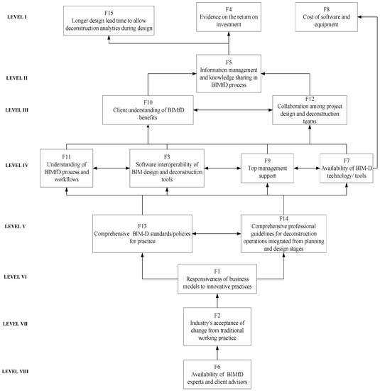 (F5)—information management and knowledge sharing in the BIMfD process was located at Level II. This factor relates to key project stakeholders’ willingness to manage data appropriately and share data with each other as required throughout the project life cycle and store it for future developments. (F5) is highly achievable once factors (F10) and (F12) are in place. (F5) relates to the capturing, processing, analysing and storing of relevant information on the project that influences deconstruction capabilities and performances at end of life of the facility, which provides data to make strategic decisions at each stage of the project life cycle. (F5) facilitates (F15), in addition to (F4) at Level I. With the data gathered, deconstructability of design alternatives can be effectively evaluated. However, client and project teams must be willing to commit to longer design times to enable the best value EoL options to be determined. Data captured from the BIMfD process provides clients and project teams with potential evidence of return from investment accruable from BIMfD implementation. (F8) is the cost of the software and equipment, which is facilitated by the availability of BIMfD tools. By economic principle, costs could be reduced when the supply for a product or service exceeds demand for the same.