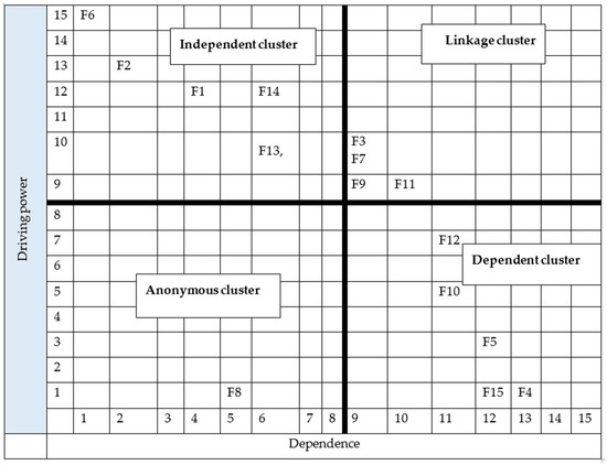 The 15 factors were further analysed using MICMAC, which categorises factors into independent, linkage-dependent and autonomous clusters based on their driver-dependence powers. The driving power of a factor is the total number of factors, including itself, which it may help facilitate or achieve, while the dependence is the total number of factors which may help support its actualisation. Following the classification adopted by previous researchers [57], the autonomous cluster possesses variables where both driving and dependence powers are low. Dependent clusters have variables where the driving power is low, but the dependence power is high. Independent cluster possess variables where the driving power is high, but the dependence power is low, and linkage clusters have variables where both the driving and dependence powers are high. The final reachability matrix was transformed into a MICMAC diagram using the sum of scores along each corresponding row to determine the power of a factor and the sum of the scores along each corresponding column to determine the dependence of a factor. The MICMAC analysis results are presented in Figure 3. The MICMAC result show that: