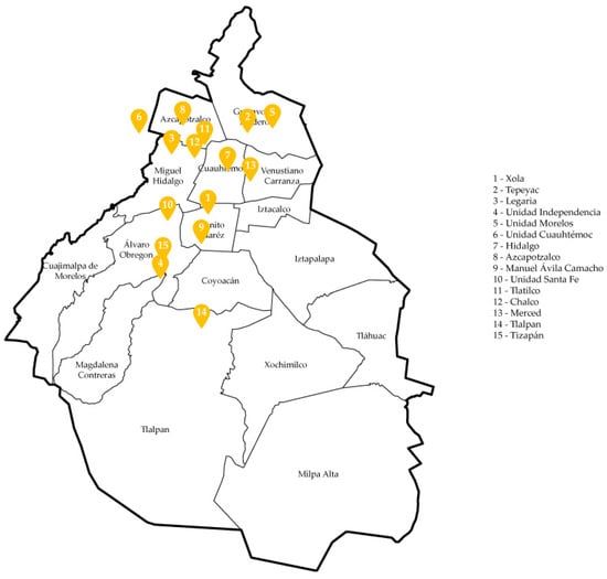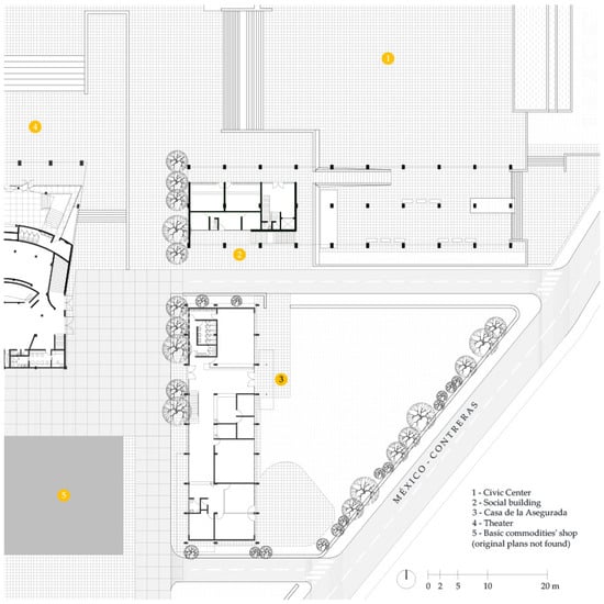 In the FAPP, found at the Institute of Aesthetic Investigations of the National Autonomous University of Mexico (UNAM), the following files were consulted: 3.3.3.15.5—Casa de la Asegurada Unidad Independencia; 250—Centro de bienestar social en Legaria DF; 252—Anteproyecto de la Casa de la Asegurada en Nicolás San Juan y Xola; 253—Maqueta—Casa de la Asegurada [sic] en Xola y Nicolás Sn. Juan; 265—Centro de bienestar social en Calz. de Guadalupe; 266—IMSS—Casa de la Asegurada Calz. de Guadalupe; 267—Casa Asegurada—Auditorium Casa de Maqs.; 272—Centro de seguridad social; and 293—Casa de la Asegurada Unidad sur. Inside these files, the original plans of the Casas de la Asegurada were found and used for the development of the third general approach of the research project.