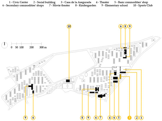 The Casa de la Asegurada is situated in the area of the housing complex popularly known as Centro Civico. It takes its name from the large square planned for civic purposes located there and is complemented by the theater, basic commodities’ shop, and social building. These buildings, at the same time, form a public open space secondary to the main square, which works as a distributor to access the backstage of the theater, as well as to the pedestrian walkways and driveways of the shop, the Casa, and the social building. The Casa de la Asegurada, along with the social building (whose lobbies are separated by a narrow driveway) and the main street adjacent to the complex, form a triangle with a garden in its interior that, taking advantage of the topography of the site, remains well isolated from the street providing an open and safe site, which is used by the Casa de la Asegurada as a leisure and playground area, directly connected to the children’s program located at the south end of the ground floor, as shown in