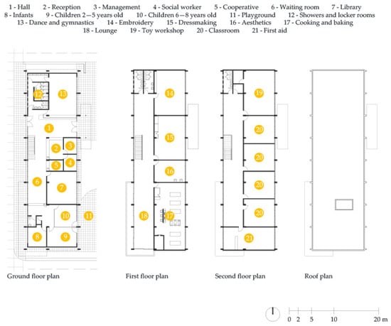 Figure 10). On the ground floor, access is possible from both sides in the middle part of the building, entering a hall that connects the stairs and a hallway that leads to both ends of the facility. In the north end, the program related to dance and gymnastics is organized, while the program assigned to childcare activities is located in the south end, directly connected to the playground. Moreover, in the middle part at ground level, the library and the administrative area are found, comprising several offices. The first floor is mainly dedicated to workshops that need fixed installations for their operation, such as embroidery, dressmaking, aesthetics, and cooking and baking. All of them are located at the eastern side of the building with the hallway facing West, restrooms in the north end, and a resting lounge in the south end supplied with a west-facing balcony. Finally, the second floor, dedicated to classrooms, is distributed in the same way as the first floor, with all of them facing east and the hallway and restrooms in the same positions.