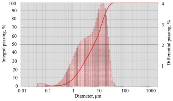 Figure 13). This is due to the peculiarities of the granulometry of the polymineral modifier. The components of the original rock have different hardness and, as a result, different grindability. This leads to the formation of a polydisperse material with a wide range of particle sizes, from ultrafine to coarsely dispersed. Thus, coarsely dispersed particles of the mineral modifier act as a filler and fill the space between the larger particles of the molding mixture, which contributes to the compaction of the products.