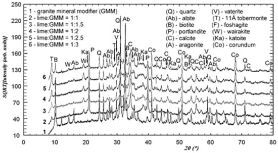 Table 6), adding the modifier to lime and subsequent autoclaving (hydrothermal treatment) does not change the concentration of the main mineral phases of the system (quartz, lime feldspar and lime) due to the fact that they participate in the processes of hydrothermal mineral formation. As a result, their content in the final product after hydrothermal treatment will be less than in the initial state of the “lime–modifier mixture”. Thus, quartz and lime feldspar, dissolving in the environment with a high pH, initiate the formation of CSH and CASH gels, from which calcium–silicate hydrates crystallize.