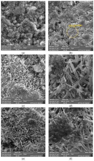 Figure 17d,f) and play the role of microfiller in the specified system, which is proven by a change in the porosity of the composites. The filler grains are also characterized by a loose surface structure; however, in contrast to the specimens of the control composition, in this case this leads to an increase in the adhesion between the filler particles and crystalline phases. In view of the fact that most of the hydrosilicates and hydroaluminosilicates formed in the systems “CaO–SiO