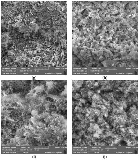 Figure 4e–j). However, it is known that the strength of autoclave materials is directly proportional to the concentration of the amorphous phase. Against the background of an ultradispersed globular mass, which cannot be identified either by structure or by XRD patterns, ultradispersed prismatic to pyramidal formations were noted (