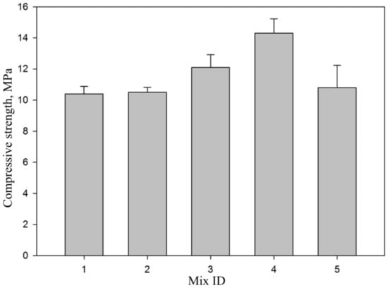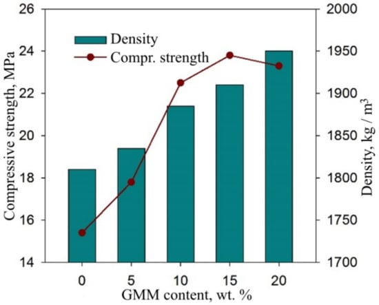 An increase in the GMM content in the system leads to growth in the compressive strength. Thus, even at a concentration of the modifier in an amount of 5%, the excess of strength is 15%. Maximum strength is observed at 15% content of the mineral additive. This contributes to an increase in strength by more than 50%, from 15.4 to 23 MPa. Obviously, the increase in strength is due to both a physical factor—the compaction of the system due to the different sizes of particles—and a chemical factor, the formation of a polymineral system of new growths.