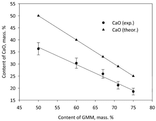 Therefore, assuming the hypothesis that lime-bearing components in reference systems were represented by 100% content of CaO (which is unlikely), the calculation of the actual lime content was calculated with the following equations: