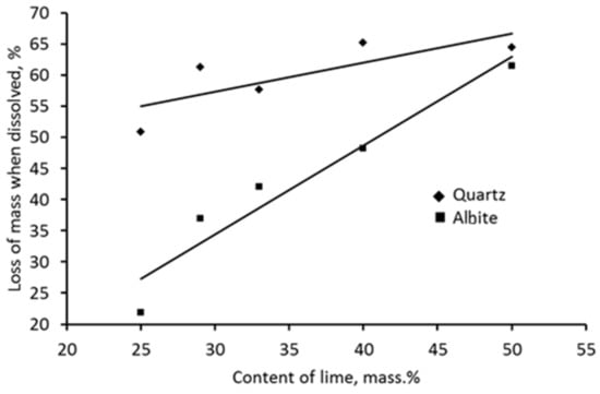 Reactivity of quartz and albite vs. lime in the reference systems is shown in