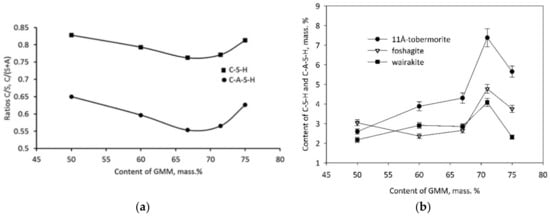 3) for CASH gel on the content in the binding system of granite component. These X-ray amorphous formations were always present in autoclave curing binders. Estimated values of C/S and C/(S + A) show that in the described experiment, CSH and CASH gels of low alkalinity are formed: C/S < 1 and C/(S + A) < 1.