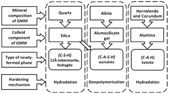 The left column indicates the factors affecting the mineral composition, the dominant chemical components of the binders and mineral growths. The proposed model shows the correlation of the mineral composition of the modifier as a raw material with the final phases formed in the process of hydrothermal treatment.
