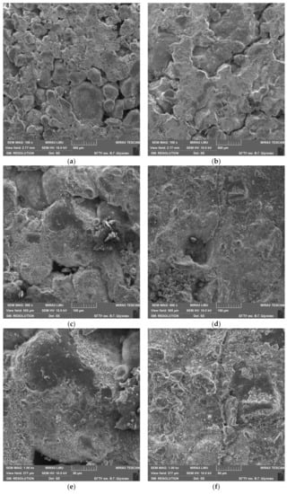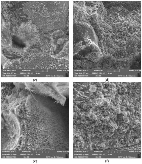 Figure 17e). Their distribution over the surface of the aggregate and over the volume of the material is uneven. However, the adhesion of coarse crystalline phases to the surface of sand particles is weak. Fine-crystalline formations, most characteristic of specimens with GMM, cover the aggregate more evenly, creating a crust on the surface of the corroded aggregate. All this ultimately affects the strength properties of the composite as a whole.