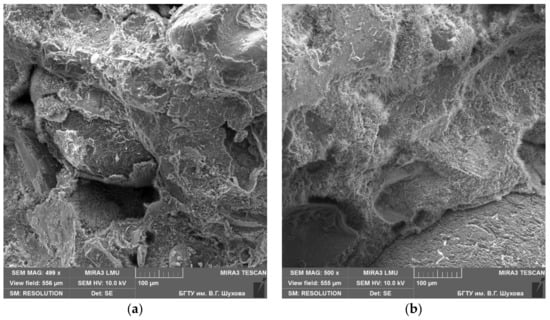 Figure 16c,e), is not observed. This is due to the large amount of binder that monolithizes the aggregate. Given the same amount of lime–silica binder in the experimental and control compositions, this can be explained by the fact that the modifier, replacing the filler, being a highly dispersed component and a more active component of the binder, intensifies the formation of a larger number of new growths.