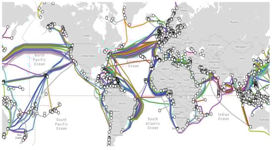 Earlier forms of undersea telecommunication used coaxial cabling, which was replaced by the more efficient optic fiber in the late 1980s, designed theoretically to carry data at the speed of light []. These cables’ diameters range from 20 to 50 mm and use either DC or AC for power transmission []. The deployment of these cables generally involves the process of burying them to a depth of 1200 m, and they are sometimes even laid in the seabed, where legally allowed, by specially equipped cable-laying ships []. Undersea fiber optic cabling forms the backbone of the internet, accounting for handling about 99% of internet data, and it is mostly owned by companies such as Google, Facebook, and Amazon, currently covering a total distance of 1.2 million kilometers [,]. Between 2014 and 2019, the cabling’s fiber investment witnessed an overall increase of USD 144.2 billion, particularly for 5G networks []. Figure 2 illustrates the cable connections around the world as it stands today.
