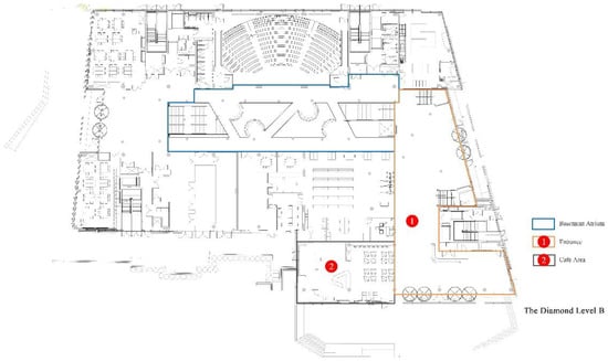 Floor plan of Diamond with different functional zones (Level B and Level E).
