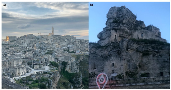 The Sassi of Matera site (Figure 1a) is composed of Sasso Barisano and Sasso Caveoso, organized in approximately 80 rupestrian villages, called casali, which were built in a vertical succession [29] (Figure 1b). In addition to this, these structures were organized in housing units that form the vicinato, a public space in which people could work and socialize [30]. Despite the city being considered one of the most peculiar cities in Italy, Matera and the Sassi site were left to decay for many years. In fact, after the Second World War, the site was deemed a “national disgrace”, in conflict with the advance of the modern era [31]. In addition to this, between the 1950s and 1970s, the living conditions of the populations who inhabited the site were below average: not only did people share living spaces with animals, leading to several endemic diseases, but infant mortality reached high levels [29]. Furthermore, there were also structural instability problems since several buildings and streets were involved in either collapses or soil sinking [32]. Only after being chosen as UNESCO World Heritage Site in 1993 was the Sassi site re-evaluated, and the city was renovated and turned into one of the major art cities of Italy, a transformation that culminated in the nomination, in 2014, for Matera as the European Capital of Culture 2019 [31].