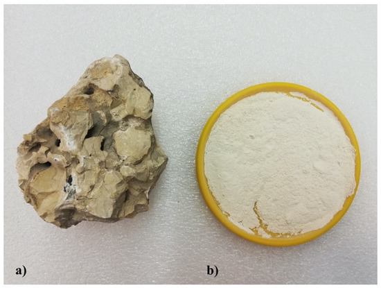 The tufo used to build the Sassi (a) and the sample reduced to powder and homogenized (b).
