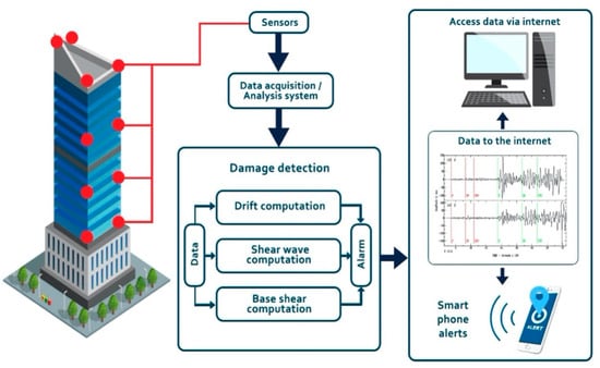 SHM systems provide information about any significant change or damage occurring in a structure. The primary purpose of structural damage detection is to identify the reason, location, and type of damage, so as to measure the damage severity and predict the structure’s remaining service life. Structural deficiencies causing collapses may result from internal factors, such as corrosion, fatigue, and ageing, and external factors, such as earthquakes, wind loads, and impact loads. The damage caused by the above factors may progress very slowly and become observable only when the structure’s damage is considerable, and sometimes it is only repairable at a high cost. The detection of structural damage is essential in ensuring structural safety during a structure’s lifetime. The structural damage detection objective is to evaluate the computable and qualitative deterioration of the structural system in service or under a severe load. It is necessary to monitor the location, occurrence, and extent of deterioration from both safety and performance viewpoints. As witnessed by the worldwide development of smart structures and materials, recent advancements in materials and sensing technologies have provided powerful new tools for improving building systems. While many of the structures have existed for decades in their basic form, the intelligence added through the various damage detection methods addresses the practical problems that challenge the effective implementation of active damage control in building structures. SHM has become a primary option for evaluating the overall behavior, preferably from the manufacturing process to the end of its service life. Figure 1 depicts the operating principle of SHM in multi-story buildings along with data acquisition and predictive analysis.