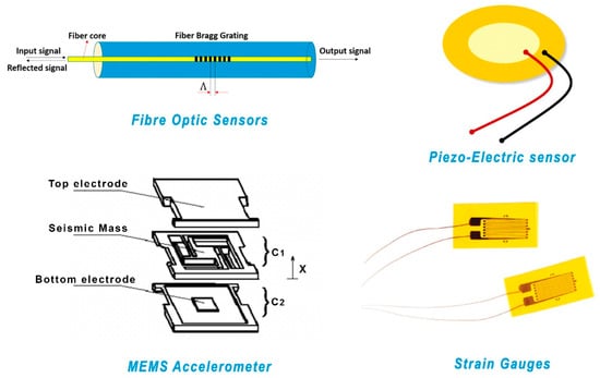 Mahjoubi et al. [23] studied a Shanghai tower with a 632 m height by applying a limited number of sensors to predict the damage and behavior of the structure. The ultimate motive of monitoring is to reduce the number of sensors and achieve optimum results, so new sensing technology is adopted, namely, a triaxial accelerometer using a hypotrochoid spiral optimization algorithm, such as flower pollination, lion pride optimization, a teaching–learning-based optimization colony, spiral optimization, particle swarm optimization, and Jaya. Three objective functions of automated modal monitoring by adopting seven algorithms are considered to identify modes. This approach is more effective in high-rise buildings. It cannot be applied to other structures without further research. Figure 3 shows some of the major sensors adopted for SHM.
