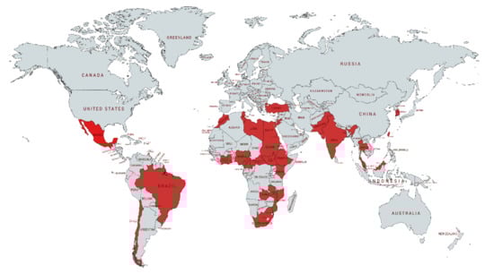 - UN. Country Classification Data Sources, Country Classifications and Aggregation Methodology Data Sources. 2014. Available online: http://data.worldbank.org/about/country-classifications (accessed on 23 July 2020).