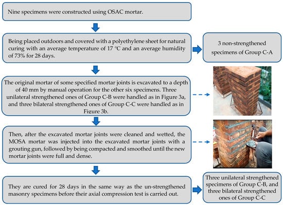 - The compressive strength of non-strengthened specimens made of fired clay brick and OSAC mortar met the requirements of vertical load bearing. The main purpose of strengthening these kinds of masonry buildings was to improve their shear strength in resisting earthquake action. Compared with the non-strengthened specimens, the compressive strength for unilateral strengthened specimens increased by 11.3% on average. Moreover, for bilateral strengthened specimens, the value increased by 11.5% on average. The experimental results showed that the compressive strength of specimens strengthened with MOSA mortar also improved, although the main strengthening purpose was to improve their shear strength.