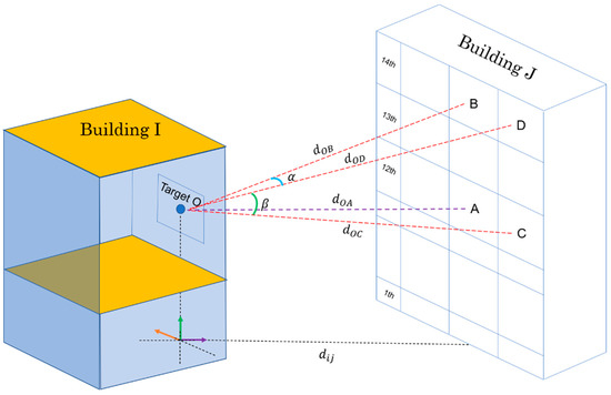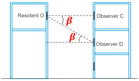 For an opening of a building, its PVEI is defined as the visual incursion by observers from public spaces and building openings. The value of PVEI depends on the distribution of potential observers, which involves the view distance, view direction, and open spaces in which both observers and targets are located. Figure 2 illustrates the concept of the PVEI in detail. Suppose a resident O (target) is standing on the 12th floor of Building I, and observers A, B, C, and D are located at Building J with the same building façade. Resident O has the potential to be viewed by observers A, B, C, and D. The sightlines are formed by the resident O and the observers as OA, OB, OC, and OD. α and β are the horizontal and vertical angles of OD, respectively.